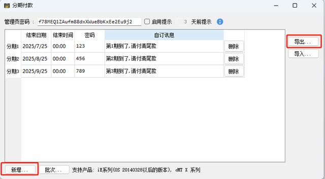 弹出的界面中点击新增,就能设置付款的时间、密码以及对应的提示,可以设置提示,提前几天坐提示,最多可以添加48个分期,也可以设置管理员密码,用来解除所有分期付款。