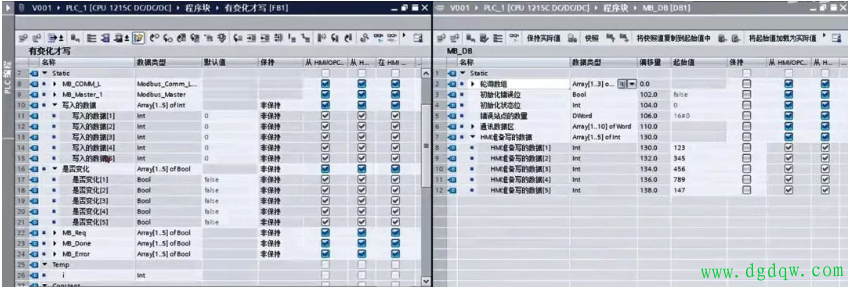 具体做法很简单:先在接口变量里,声明“已写入数据”和“准备写入数据”(比如5个从站就各声明5组);准备写入的数据来自触摸屏,用循环逐站比对,要是两者不一致,就把变化标志位置为真;哪个从站标志位为真,就触发对应的写操作,记得每个从站的站号、寄存器地址等要单独设置;写操作完成后,再把“准备写入数据”更新到“已写入数据”,保持同步,方便下次比对。